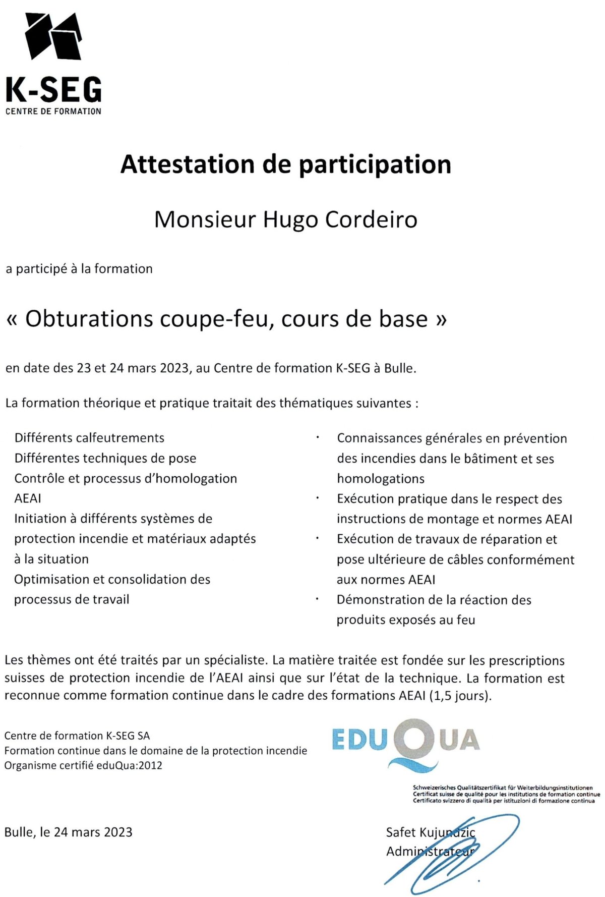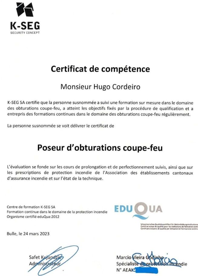 70 % des entreprises en Suisse ne le font pas dans les normes, ce qui est très regrettable, car la formation est individuelle et non collective, ce qui signifie que chaque poseur d'obturations coupe-feu doit suivre une formation et obtenir un certificat tous les deux ans !