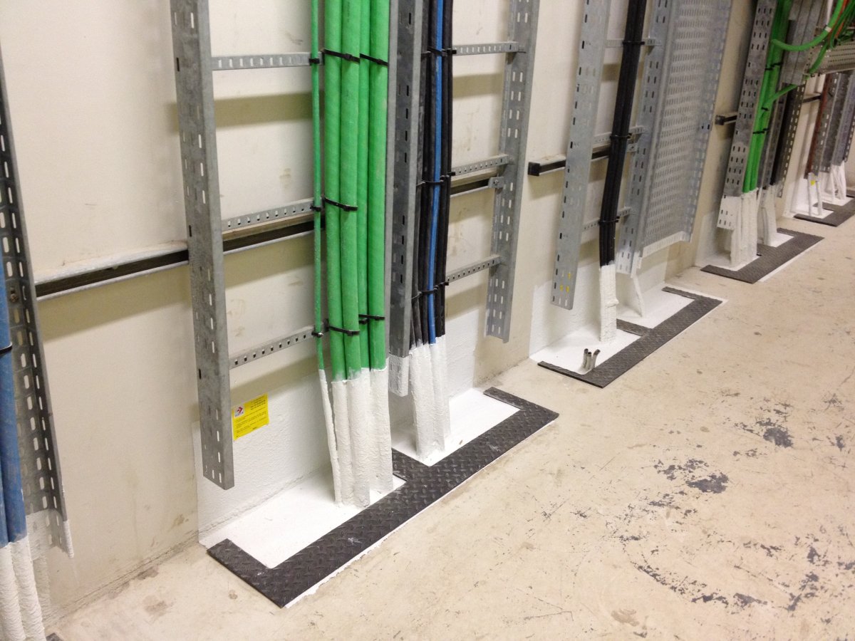 Utilisation de matériaux résistants au feu (RF1) pour l'isolation des câbles et des tuyaux, et de systèmes d'obturation approuvés pour les passages.